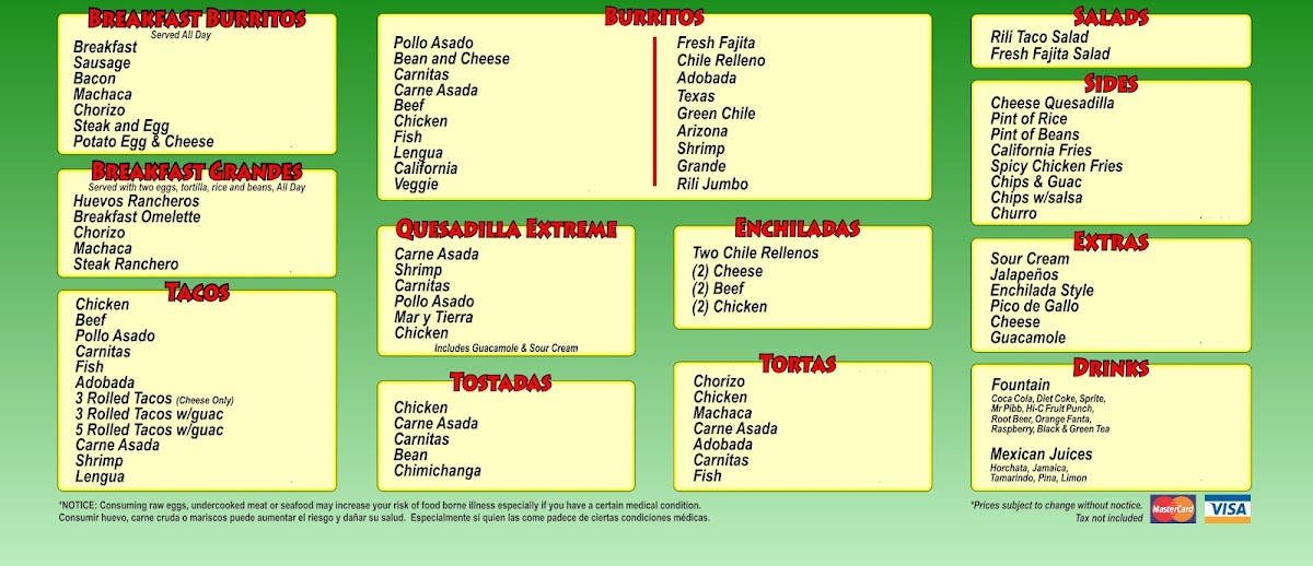 The menu at Riliberto’s Fresh Mexican offers a straightforward, approachable selection of classic Mexican dishes crafted for casual dining. You’ll find everything from hearty tacos and satisfying tortas to flavorful quesadillas and comforting enchiladas, all served in a relaxed setting that welcomes both quick lunches and leisurely dinners.